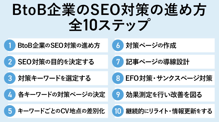 ここでは、BtoB企業のSEO対策の進め方を10つのステップにわけて解説します。