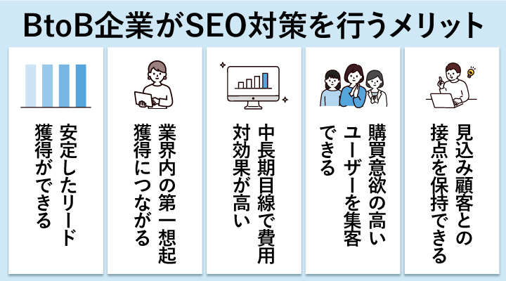 BtoB企業がSEO対策を行うメリットは以下のとおりです。