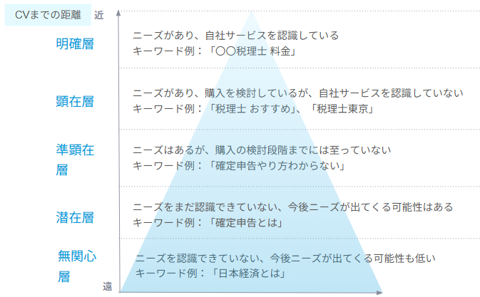 その場合、顕在層向けのページと同じCV導線を作成しても、潜在層には刺さらない傾向にあるため、潜在層向けのCV導線、顕在層向けのCV導線と、キーワードごとにCV地点の設計を調整することが重要です。