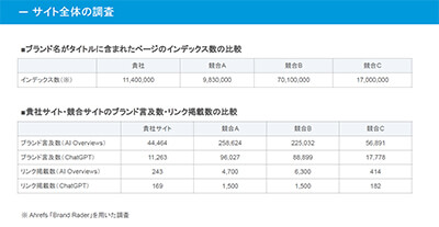 - AI Overviews / ChatGPTでの貴社ブランドの言及状況調査・競合比較
