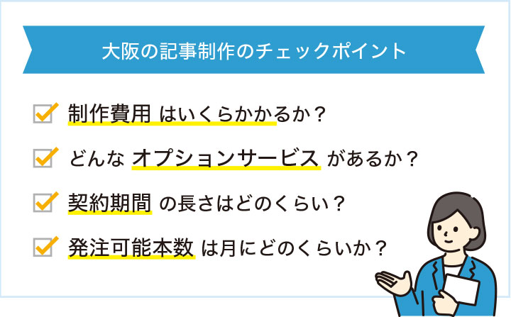 費用や契約期間、SEO対策可能な領域、記事制作サービスの有無など、契約の際に気になる点をリストにまとめているので、ぜひ参考にしていただけますと幸いです。
