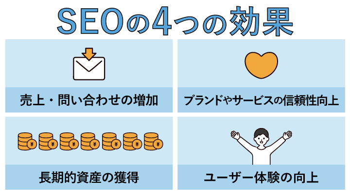 SEOがもたらす効果とは、主に「売上・問い合わせの増加」「ブランドの信頼性向上」「長期的資産の獲得」「ユーザー体験の向上」の4つです。