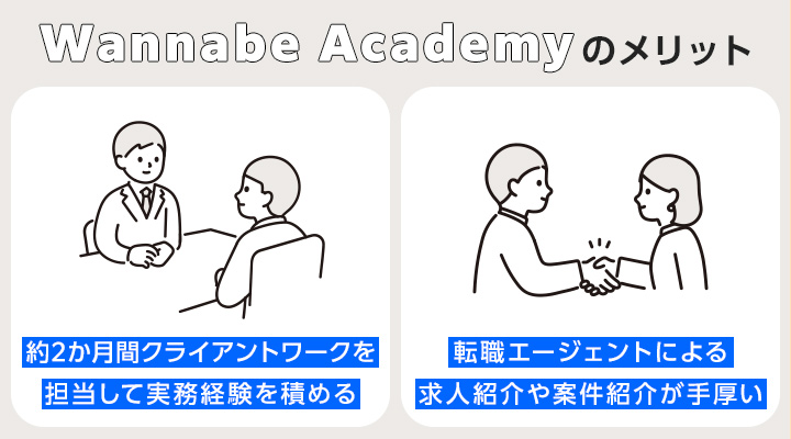 例えば「Wannabeアカデミー」では、基礎修了後の2カ月間で実際のクライアントワークに参加できます。実践的スキルが身に付くのはもちろん、経歴として実務経験を加えられる点が独学と異なり、転職や案件営業の際にアドバンテージとなるでしょう。