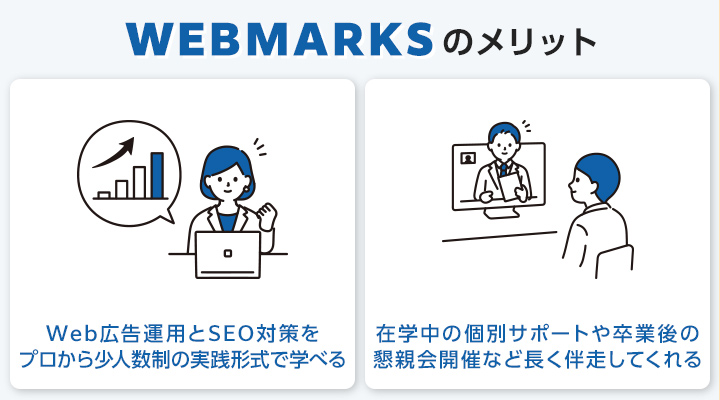 WEBMARKSはWeb広告運用とSEO対策を少人数クラスでプロから学べて、初歩的な知識から発展まで網羅して習得できるWebマーケティングスクールです。