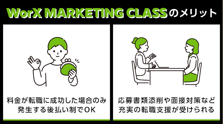 WorX MARKETING CLASSでは、受講料が後払い制となっており、転職に成功した場合のみ給与額面の10%を2年間支払う形式を取っています(※1)。仮に転職ができなかったときは受講料が無料になるため、損をしてしまうリスクを負わずにWebマーケティングスキルを学ぶことができます。